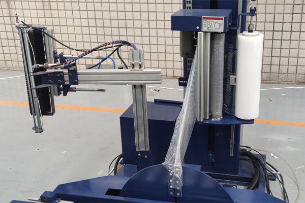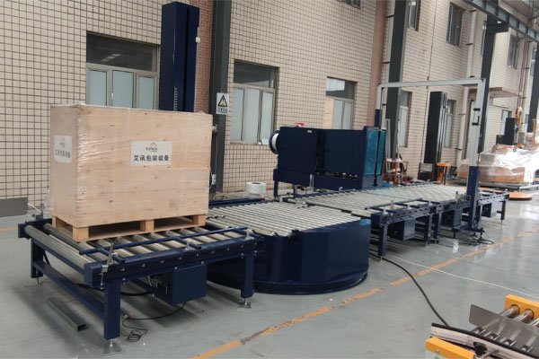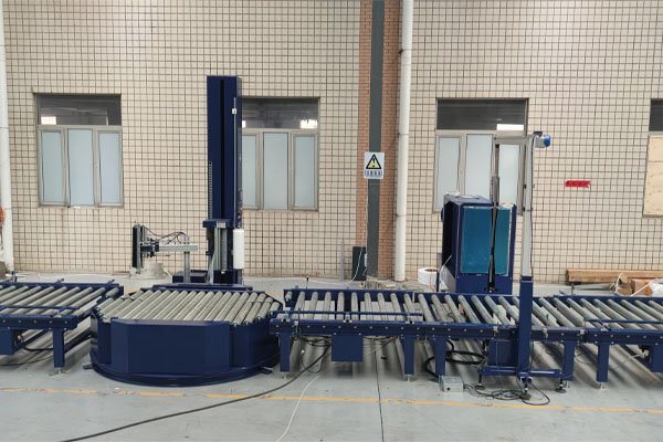 該線體主要實現(xiàn)對白卡紙紙卷捆扎和纏繞,線體一共由三部分組成:棧板穿劍捆扎機,托盤在線纏繞包裝機,滾筒輸送機。如用戶有其他包裝需求,該線體亦可配套覆頂膜機、水平捆扎機、護角機、在線貼標噴碼等設(shè)備。