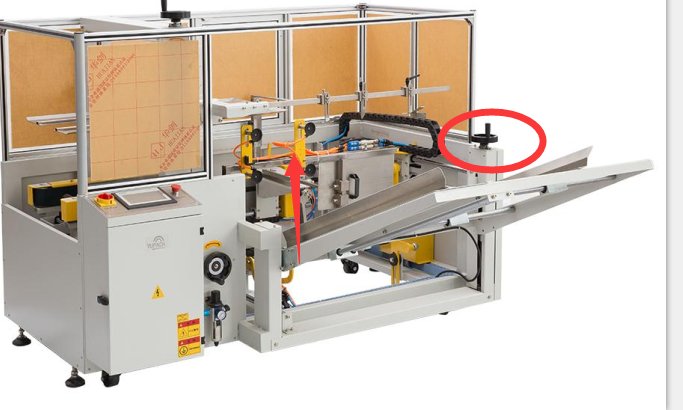 2、無法正常折箱。開箱機(jī)不能折底時(shí),機(jī)器會報(bào)兩種錯(cuò)誤,折前蓋超時(shí)或者折后蓋超時(shí),一般出現(xiàn)這樣的情況如果排除了紙箱太厚 太硬沒有折上去的情況下,多半是因?yàn)榱蟼}調(diào)節(jié)的不夠高,導(dǎo)致這前蓋和折后蓋的氣缸并沒有接觸到前蓋和后蓋,因此會報(bào)錯(cuò),用戶只需要調(diào)節(jié)這個(gè)手柄,將料倉的高度向上抬高一點(diǎn)即可。