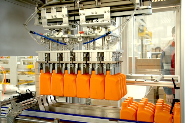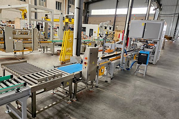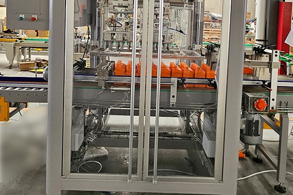 桶裝箱是裝箱案例中非常典型的的產(chǎn)品,針對不同桶的類型以及瓶口直徑的大小、效率的不同,裝箱機都會有所變化。該套機油桶裝箱包裝線是由高速熱熔膠開箱機、平移式裝箱機、熱熔膠封箱機、自動稱重剔除機組合而成。
