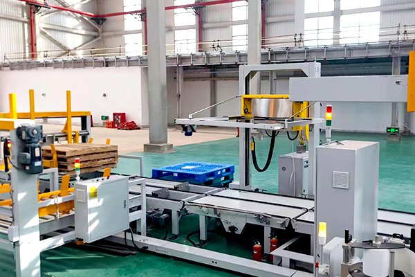 油桶碼垛線是區(qū)別于紙箱與袋碼垛方式的不同碼垛形式,該線體主要由供棧機(jī)、桁架碼垛機(jī)、油桶定位和旋轉(zhuǎn)裝置以及托盤捆扎機(jī)組合而成,油桶定位和旋轉(zhuǎn)裝置可以將桶輸送到指定位置,并按照指定要求,將桶的標(biāo)志面都朝向托盤外側(cè),方便讀取信息。同時(shí)配以桁架式碼垛機(jī),將1-2桶物料抓取平移后,碼到指定托盤上。