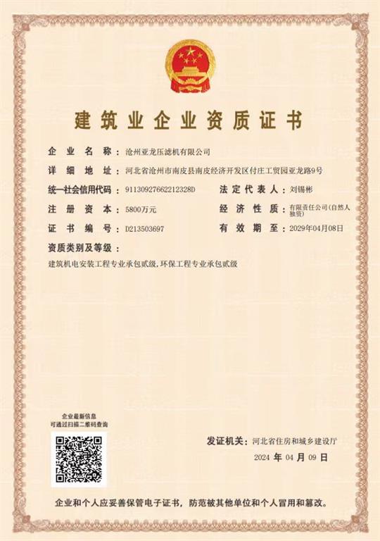 亞龍壓濾機(jī)順利通過(guò)建筑業(yè)企業(yè)資質(zhì)證書(shū)